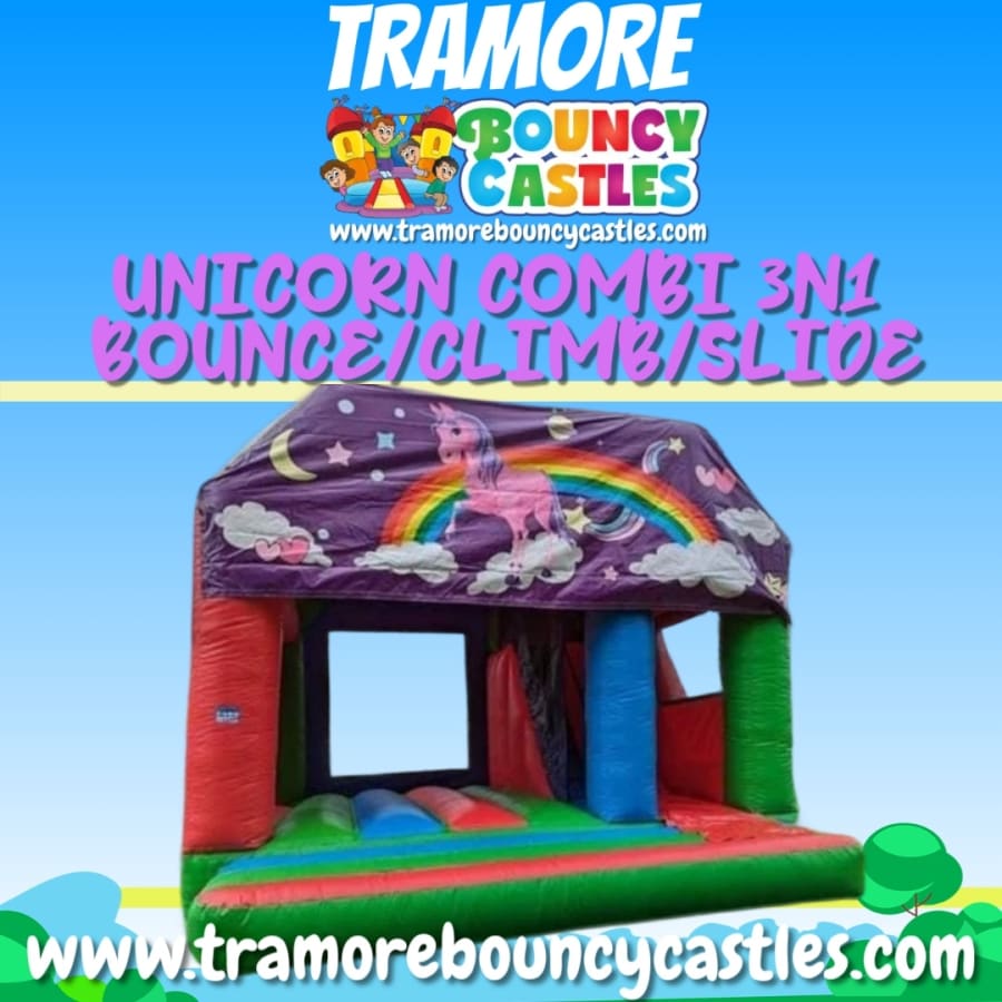 Step into a world of birthday magic with our Unicorn themed bouncy castle combi unit. Featuring a fully enclosed and safe spacious bouncy area with a slide to the side, it's suitable for children of all ages and perfect for birthdays, communions, confirmations, family fun days, and so much more!