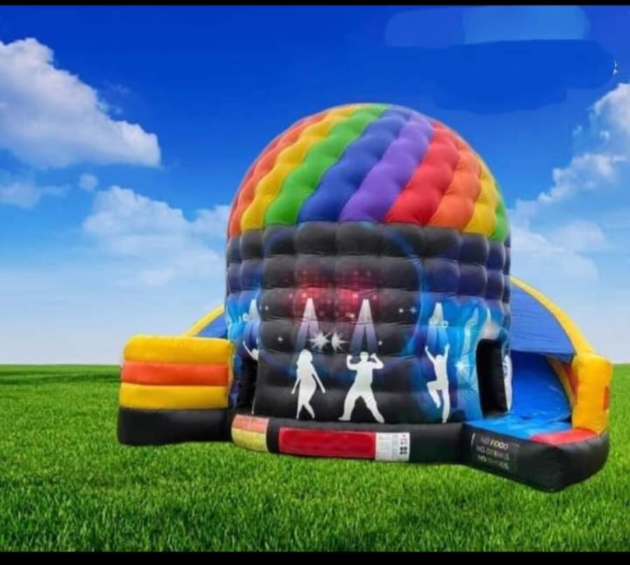Description: 20ft(L) x 17ft(W) x 14ft(H) Trendy Purple & Blue Inflatable Dome with Bouncy Floor.... Why Hire a DJ when you can hire this? Neutral theme without any childish artwork, suitable for kids of all ages. This dome is easy to access for all ages as there are no squeeze doors. The dome is fitted with a Bluetooth enabled music system, meaning your guests can connect their phones to send music to the Bouncy Castle! How Cool! The dome is also fitted with a flashing lighting system, which is reflected off the gloss black interior, bouncing the light all around the dark chamber. The exterior high multi-coloured roof is a sight which will be seen all around with a huge visual impact.