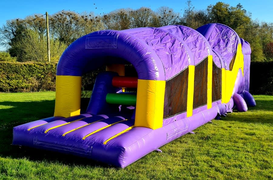 This massive Obstacle Course has two slides, a rock climbing wall, a bish and bash area and bouncy areas within. It is fully covered with safety netting to each side for ease of monitoring and supervision. This inflatable is perfect for birthday parties, communions, confirmations, school days, sports days and festivals. Our obstacle courses come in all shapes, sizes and colours and they are suitable for kids of all ages.