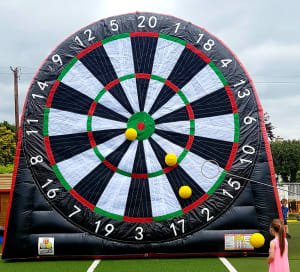 This is the perfect inflatable for all the family to enjoy, both young and old. This is a velco inflatable designed like a dart board and is two sided. It is hired with 4 velco footballs and you have to kick the football at the inflatable board and try to get the highest score possible from your four footballs. Competitors can use both side of the board at the same time, meaning it will keep numerous people entertained at any one time. Its also great fun to watch.